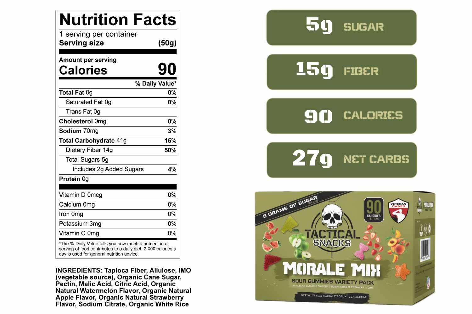 We worked with top flavor formulators to ensure Tactical Snacks taste just like your favorite candyโwithout the guilt. Our formula uses sugar alternatives like monk fruit, tapioca syrup, and allulose, which have fewer calories but deliver the same satisfying sweetness.